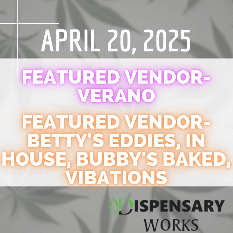 Sunday 4/20Featured Vendor- VeranoFeatured Vendor- Betty’s Eddies, In House, Bubby’s Baked, Vibations